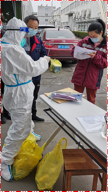 公司加強快遞物品安全管理,在警衛室外,專門設立國外快遞消殺區,國外件送到公司后,警衛立即佩戴一次性手套,外部再次消毒后放置到規定區域,同時當班警衛匯報給行政部沈靜南,上報鎮工辦工作人員。等衛生防疫人員到公司進行消殺和對快遞進行核酸檢測,結束后警衛通知收件人到現場拆件。同時要求接觸國外件的人員兩周做一次核酸檢測。(圖為鎮工辦防疫工作人員在對國外快遞進行核酸檢測)